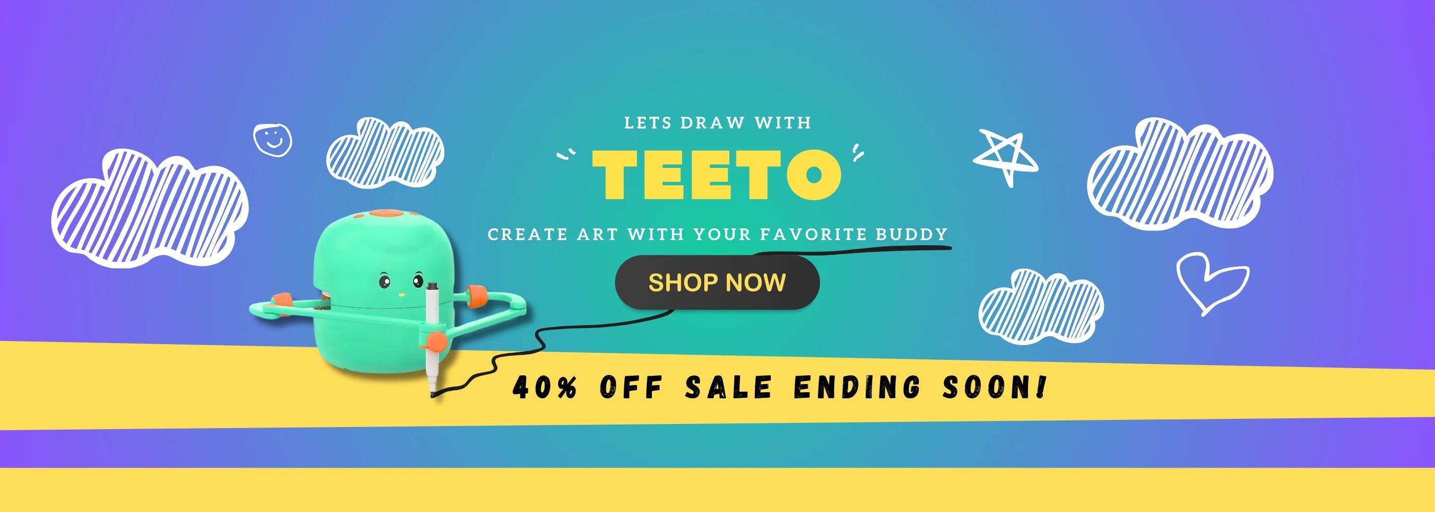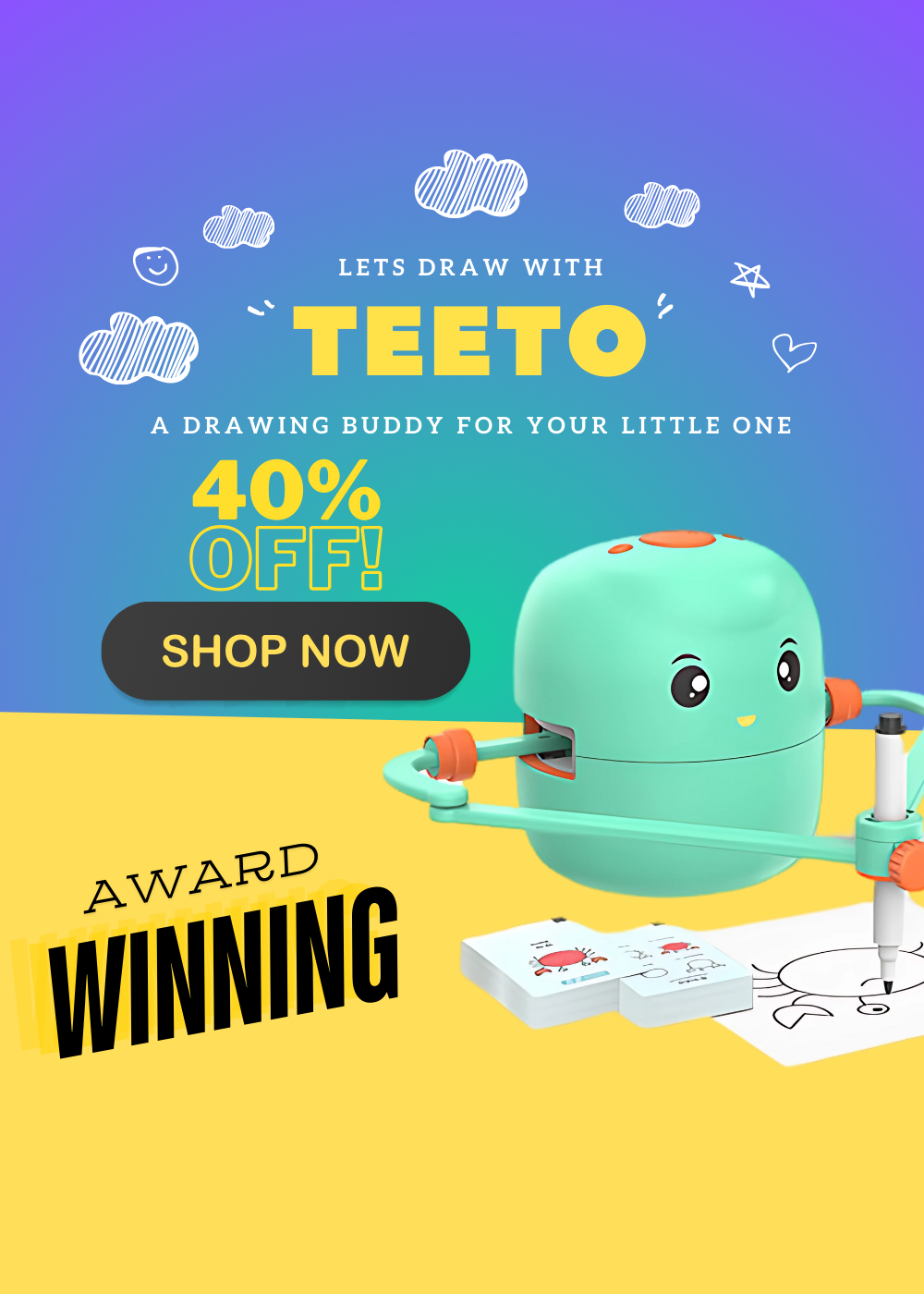 Bring joy and discovery into your child's world with the TEETO™! Equipped with easy-to-use drawing cards, this robot makes creating art effortless and exciting for kids. Its precision technology replicates intricate designs, keeping little ones captivated while teaching them the fundamentals of shapes, patterns, and creativity.